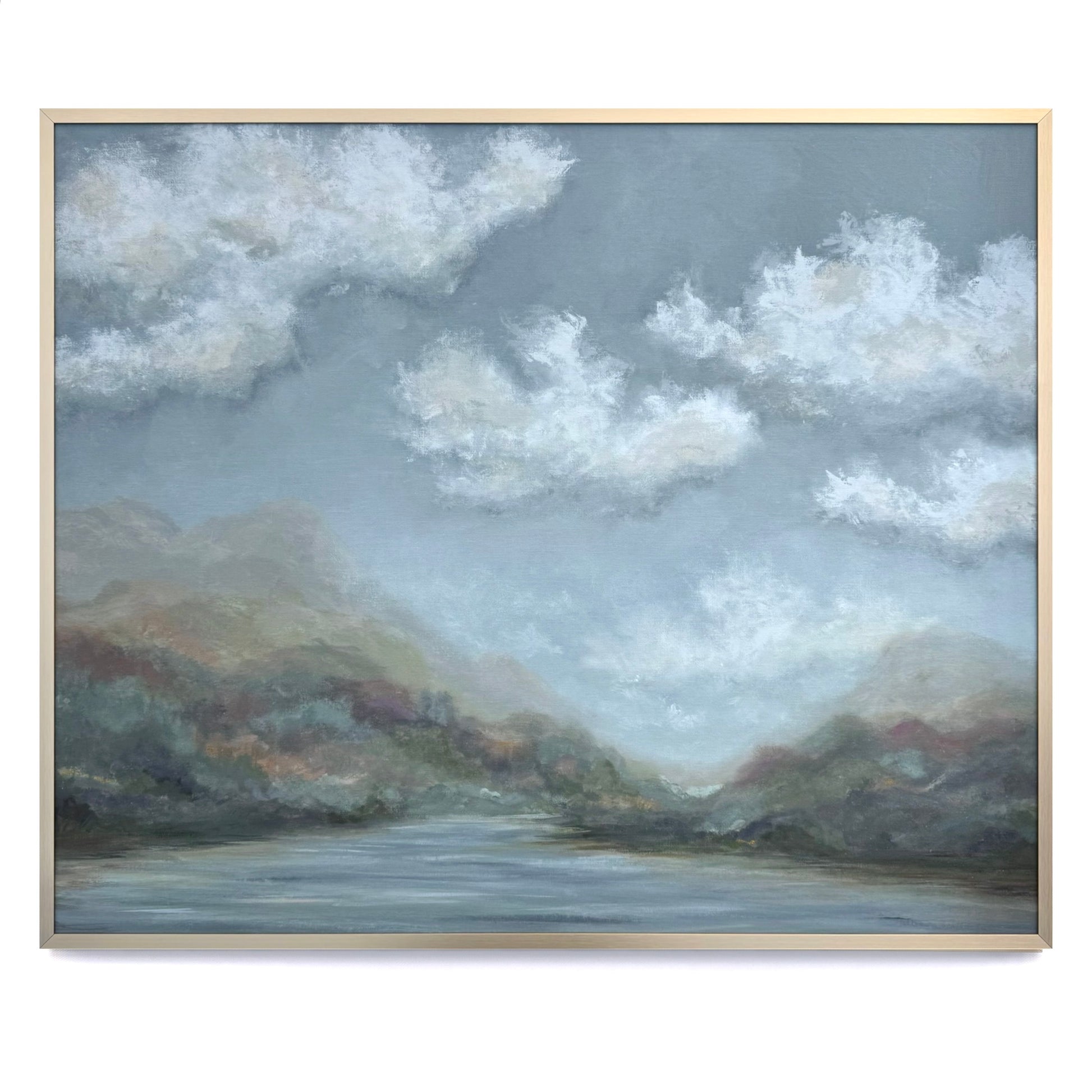 Original 20x24 landscape by Jessica Kime. Artwork is acrylic on canvas, framed in a brushed brass frame, ready to hang on the wall for a statement. Zoom in for all the layers, colors, and details. This one is a Jessica Kime favorite!